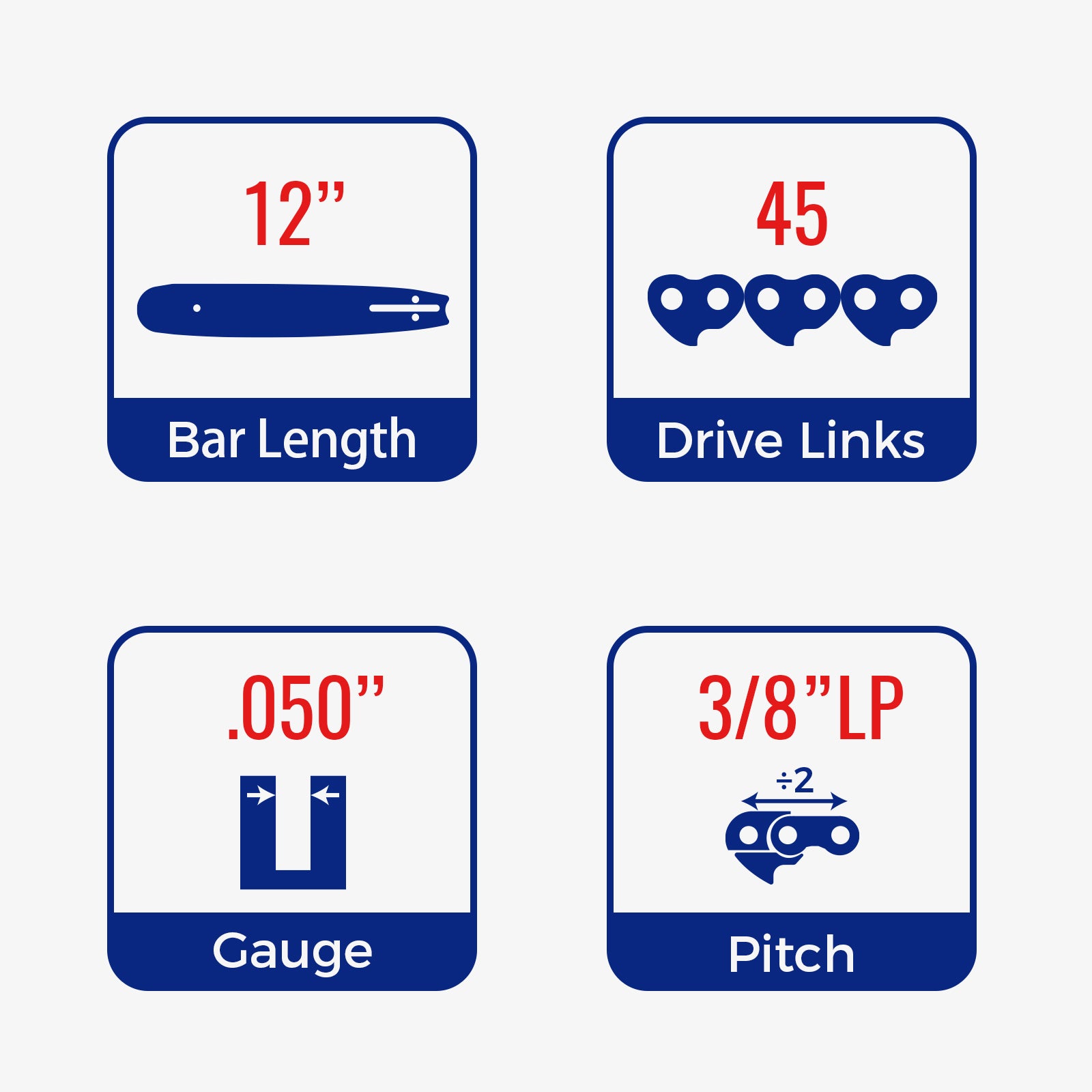 【SPECIFICATIONS】 5 Pack 12 Inch, 3/8" LP Pitch, .050" Gauge, 45 Drive Links;5 Pack 14 Inch, 3/8" LP Pitch, .043" Gauge, 52 Drive Links;5 Pack 16 Inch, 3/8" LP Pitch, .043" Gauge, 55 Drive Links;5 Pack 18 Inch, 3/8" LP Pitch, .050" Gauge, 62 Drive Links;